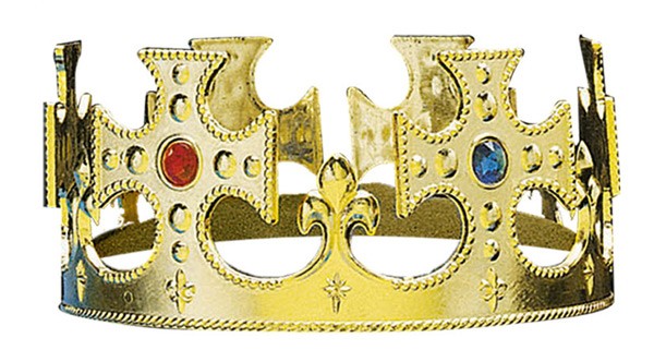 Királyi jelmez kiegészítő. Színes kövekkel díszített, műanyag korona, arany színben.