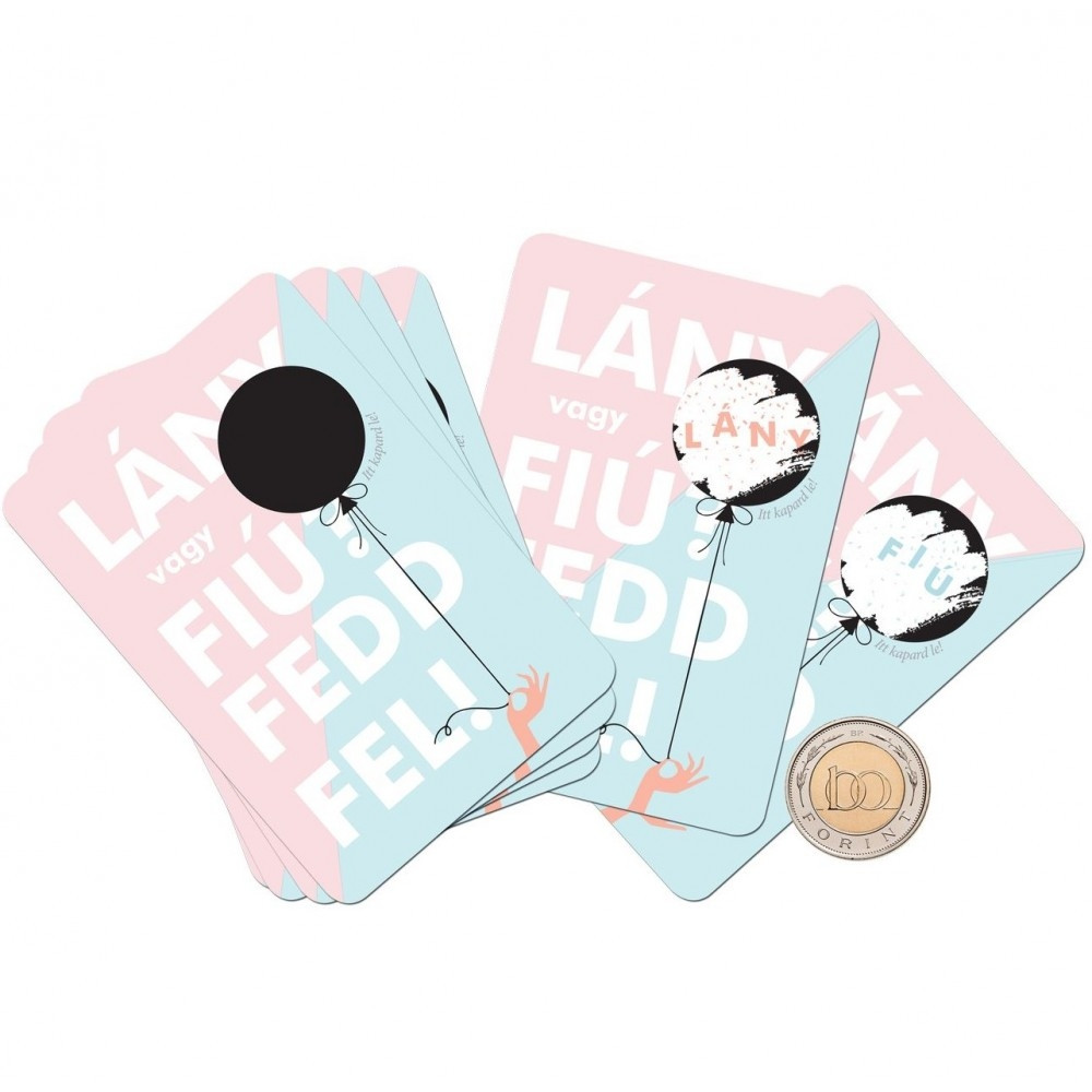 A kártyán a fekete lufi felülete kaparós réteg, így egy kis pénzérmével könnyedén le lehet kaparni a réteget és máris felfedjük a baba nemét.
