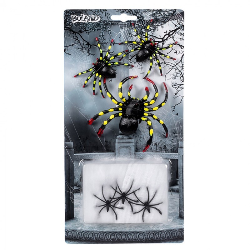 A szett tartalma: 3 db dekorációs, színes pók (1 db 10 cm-es és 2 db 7 cm-es), 1 db pókháló 3 db fekete pókkal, melynek mérete 3 cm.