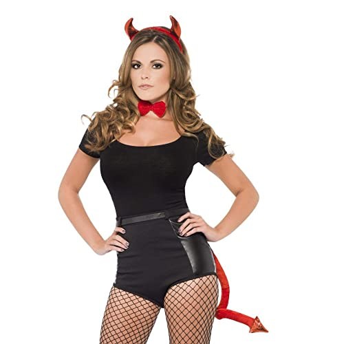 Piros színű, lurex anyagú szarvak, hajráfon. Piros, bársony csokornyakkendő. Piros, bársony farok.